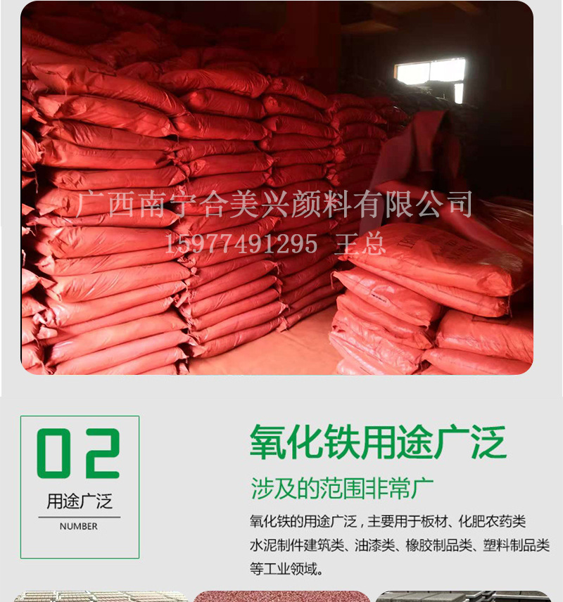 氧化鐵顏料主要用于建筑結(jié)構(gòu),水泥制件的著色,各種室內(nèi)外的建筑表面,如墻面、地坪、天花板、支柱、廳廊、階梯、路面、停車場(chǎng)、車站等,2.各種建筑材料,如磚、面磚、地磚、屋瓦、彩色路面,彩色地磚,建筑材料,嵌板、水槽、水磨石、馬賽克花磚、人造大理石、石棉水泥板等。3,油漆、涂料和噴漆的著色和防銹:適用于各種涂料、油漆著色,可用于涂料油漆中底漆、膩?zhàn)?、面漆的著色?,廣泛用于建筑模板,涂料油漆,橡膠,塑料等著色,顏色穩(wěn)定,顏色鮮艷,著色力強(qiáng)。